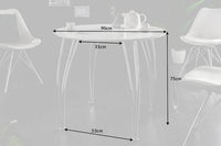 Wenn Du es in Deinem Zuhause lieber etwas cleaner und modern magst, könnte Dir dieser kleine, runde Esstisch gut gefallen! Die weiße, stabile Tischplatte wir von vier elegant geschwungenen Beinen aus verchromtem Metall getragen. Dank seiner kompakten Größe kannst Du den Tisch zudem in jedem Raum, egal welche Größe platzieren und mit bis zu vier Stühlen Deiner Wahl bestücken.