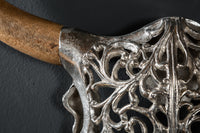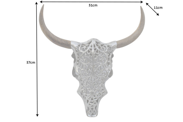 Der Schädel aus hochwertiger Metall-Aluminium-Legierung wurde aufwändig mit orientalisch anmutenden Ornamenten verziert. Diese verleihen der Wandskulptur durch ihr durchscheinendes Design eine gewisse Leichtigkeit, welche einen filigranen Kontrast zu den massiven Hörnern aus handgearbeitetem Mangoholz bildet. Kombiniere den Stierkopf ganz nach Deinem Geschmack mit unterschiedlichsten Einrichtungsstilen und verschiedenen Möbeln – er wird immer eine tolle Bereicherung Deines Ambientes werden!