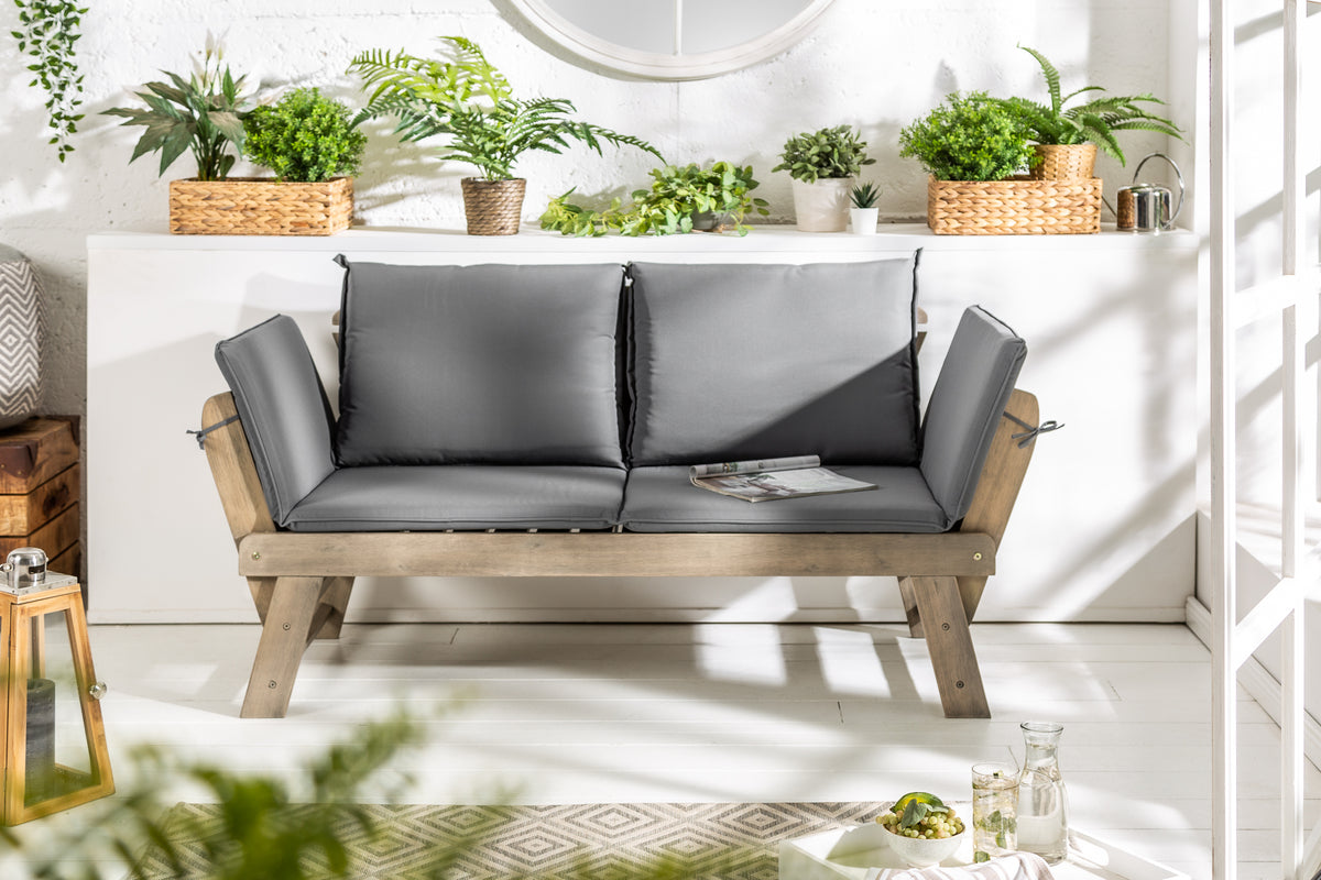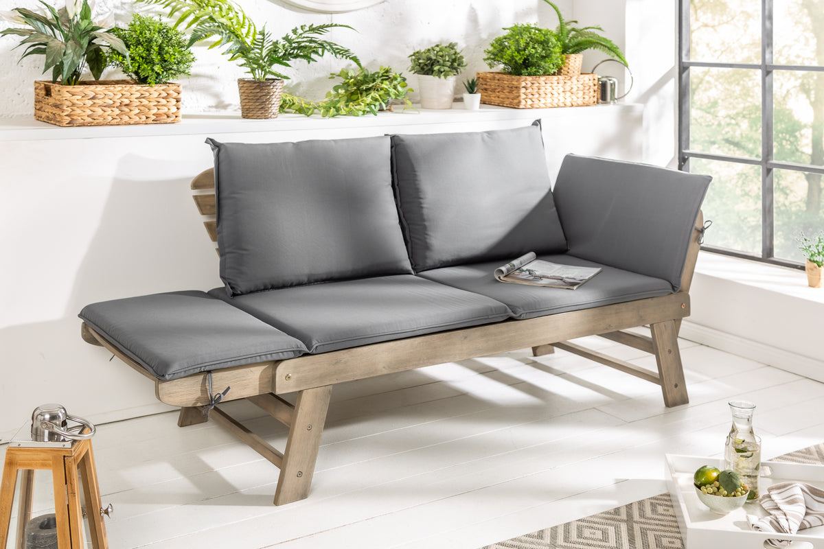 Unsere Sitzbank MODULAR begeistert mit absoluter Vielseitigkeit. Die formschöne Sitzbank aus massivem Akazienholz im grauen Finish punktet nämlich nicht nur mit ihrem zeitlosen Design, sondern auch mit unübertroffener Funktionalität. Die beiden Armlehnen der Bank lassen sich in drei Stufen verstellen – so wird aus einer gemütlichen Sitzbank mit Armlehne in Handumdrehen eine Liege. Der graue Bezug der Kissen passt hierbei perfekt zum grauen Finish des Holzes.