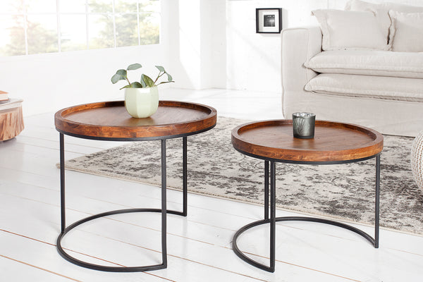 ELEMENTS Industrial 2er Set Beistelltische 60cm Mangoholz massiv rund schwarzes Metallgestell