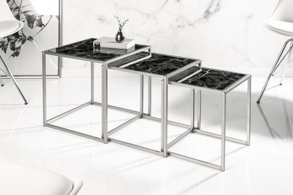 ELEMENTS Design Beistelltisch 3er Set 40cm schwarz Glasplatten in Marmoroptik