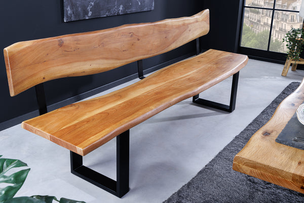 Massivholz Sitzbank MAMMUT 200cm Akazie Baumkante mit Lehne schwarzes Metallgestell