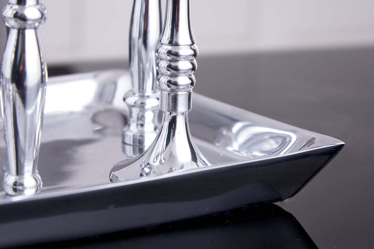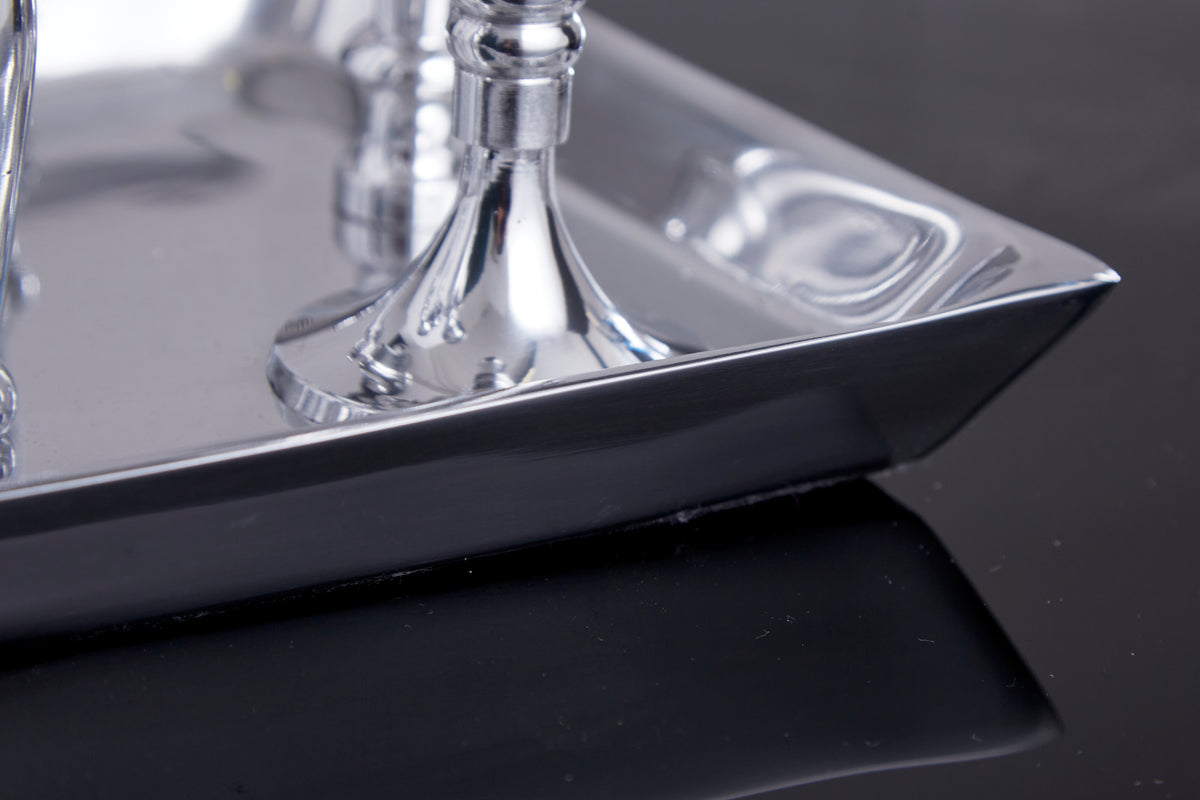 Die Kerzen werden angezündet, leise spielt die Musik und wohltuende Düfte strömen aus. Es sind die kleinen Dinge im Leben, die Freude bringen und Momente voll schöner Erinnerungen schaffen. Der Kerzenständer mit sieben Elementen und eleganten Tablett passt in dieses wundervolle Bild. Ein modernes Design im klassischen Stil, elegant und silberfarben poliert ist jedes Stück ein Unikat.