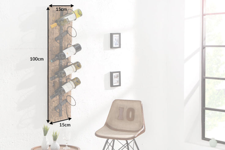 Dieses massive Wandregal wird Deine wertvollsten Weinflaschen gekonnte in Szene setzen. Es handelt sich um eine gelungene Kombination aus recyceltem Holz und Eisen. Die rustikale Oberfläche, an denen die 6 Halterungen aus Eisen befestigt sind, besticht durch ein rustikales, unbehandeltes Design. Die von der Natur entstandenen Risse und Furchen wurden bewusst verarbeitet und belassen. So wird jedes dieser Weinregale zum Unikat! Setze Deine Weinflaschen mit diesem einzigartigen Wandregal gekonnte in Szene. Durch das unverwechselbare und stilvolle Auftreten des Wohnaccessoires ist es nicht nur praktisch, sondern auch ein echter Eyecatcher in Küche oder Wohnzimmer.