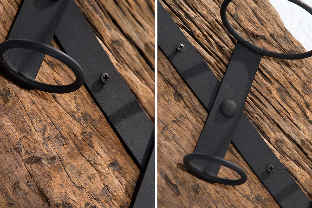 Das markant recycelte Teakholz, geprägt durch Jahrzehnte lange Kämpfe mit Natur und Witterung, macht dieses Wohnaccessoire zu einem unverwechselbaren Einzelstück. Gefertigt aus Bootsstegen, Booten und alten Fischerhäusern, erzählt uns dieses Weinregal seine ganz eigene Geschichte. Entdecke das Wandregal als ein Wohnaccessoire, das es nicht von der Stange gibt und ein einzigartiges Flair versprüht. Die unverwechselbaren Farben und Furchen des unbehandelten Teaks kombiniert mit den Halterungen aus Eisen machen dieses Möbelstück zu etwas ganz Besonderem.