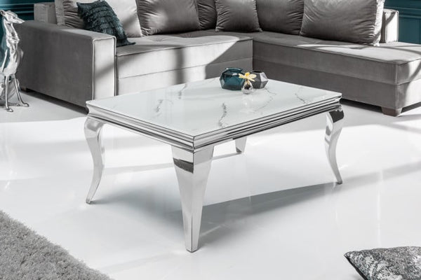 MODERN BAROCK Eleganter Couchtisch 100cm Glasplatte in Marmoroptik Edelstahlbeine