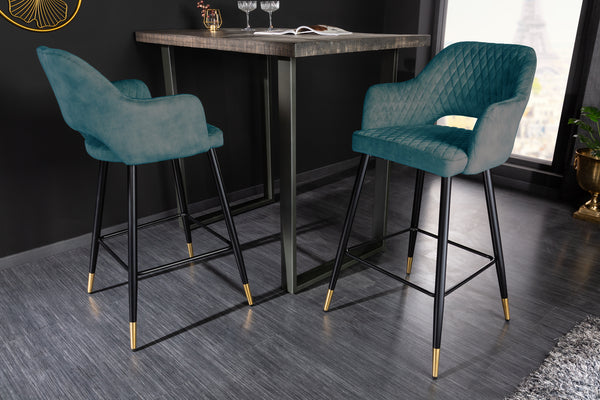 PARIS Design Barhocker Samt Ziersteppung Fußkappen gold mit Armlehnen