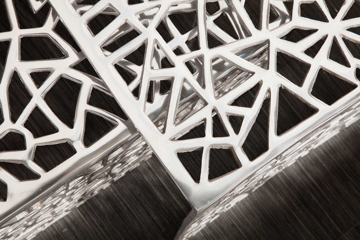 The use of aluminum as the only material makes this coffee table set not only extremely easy to care for, but also stable and quite modern in its surface appearance. Fine, intricate lines radiate a playful atmosphere and pleasantly brighten up particularly simply designed living rooms. The stylish design coffee table ABSTRACT is elaborately handcrafted, making each piece unique. Since the two tables only rest on the floor on two sides, they offer plenty of legroom in the middle for comfortable sitting positions on the couch.