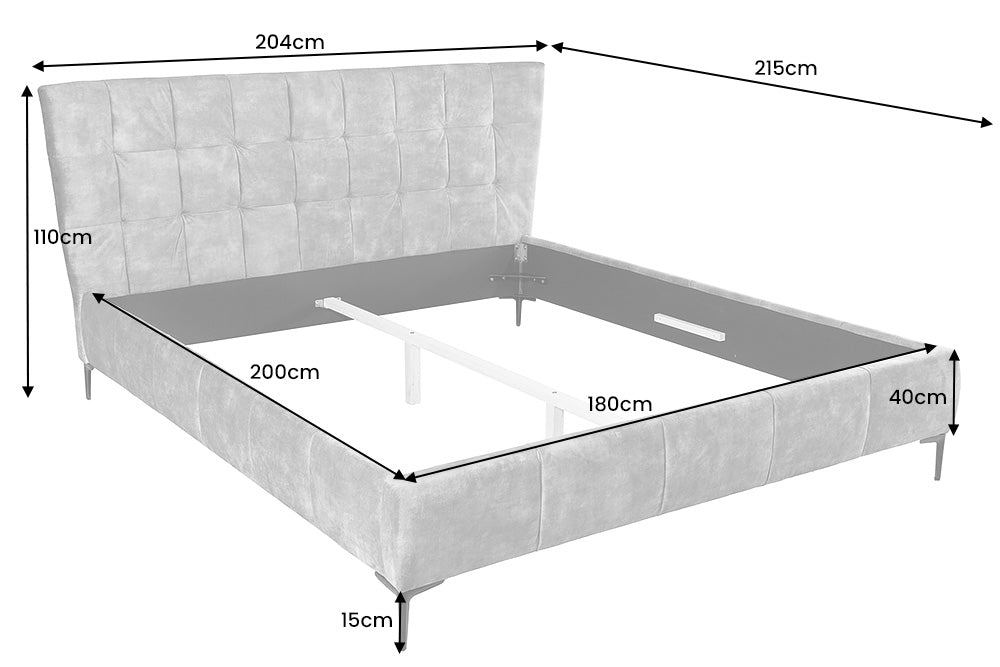 Discover our exclusive gray upholstered bed: a true masterpiece of elegance and comfort that will make your nights restful. This high-quality double bed is not only a piece of sleeping furniture, but also a design statement for your bedroom! Our exclusive gray version gives this bed a timeless beauty. The entire bed frame is covered with a luxurious velvet cover that is not only pleasant to the touch but also visually impressive. The sturdy metal legs in black ensure reliable stability and give the bed a modern touch.
