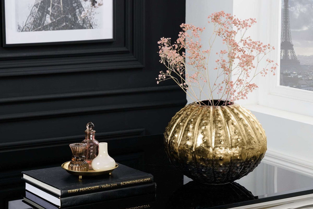 Für alle, die Dekoration lieben, ist die Vase ABSTRACT in Gold ein absolutes Must-have. Diese imposante Vase fügt sich mühelos in jedes Ambiente ein und bietet Platz für frische Blumensträuße, Trockenblumen oder dekorative Zweige – gestalte sie ganz nach Deinem individuellen Geschmack. Das kugelförmige Design der Vase verleiht ihr eine besondere Note und macht die Kugelvase zum Highlight in jeder Dekoration. Gefertigt aus hochwertiger Metall-Aluminium-Legierung besticht diese handgefertigte Vase durch ihre beeindruckende Oberflächenstruktur, die im Grid-Hammerschlag-Design bearbeitet ist. Die Oberfläche der unteren Hälfte wird in einem aufwändigen, chemischen Prozess hergestellt, durch den jede Vase ihre einzigartige Patina erhält. Mit ihrem glänzenden Erscheinungsbild wird die goldene Vase zweifellos zum extravaganten Wohnaccessoire in Deinem Zuhause!