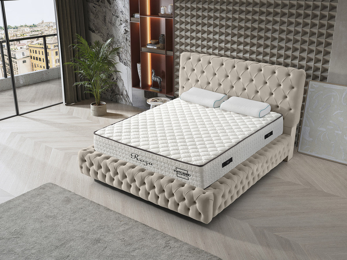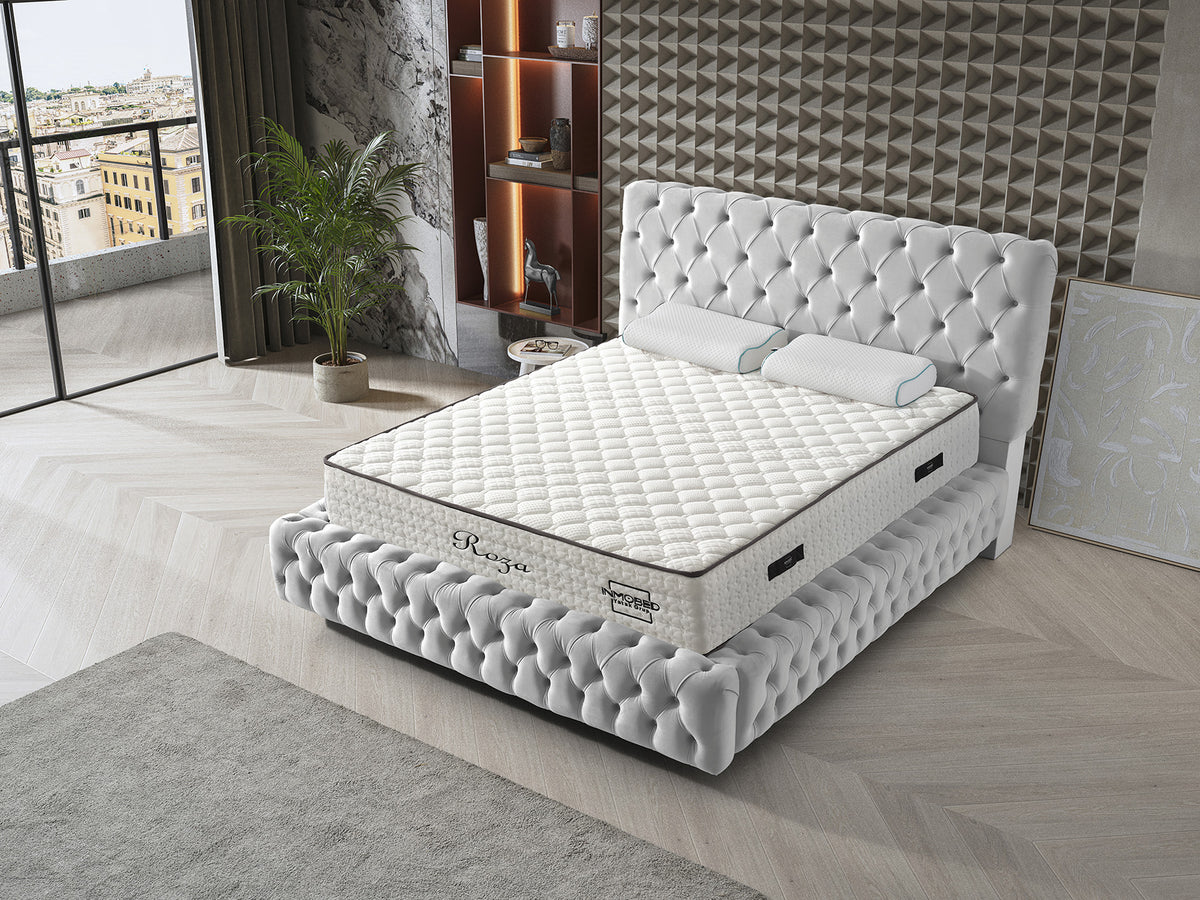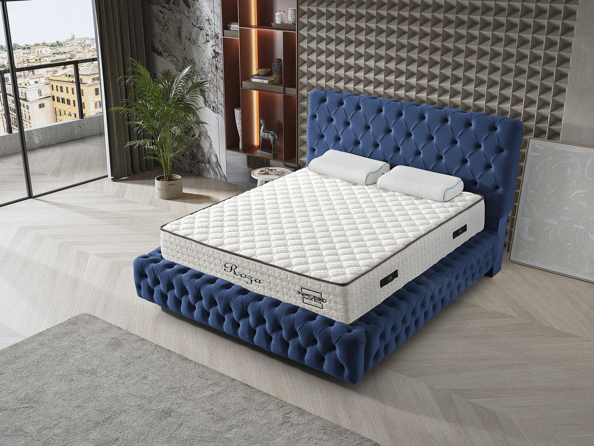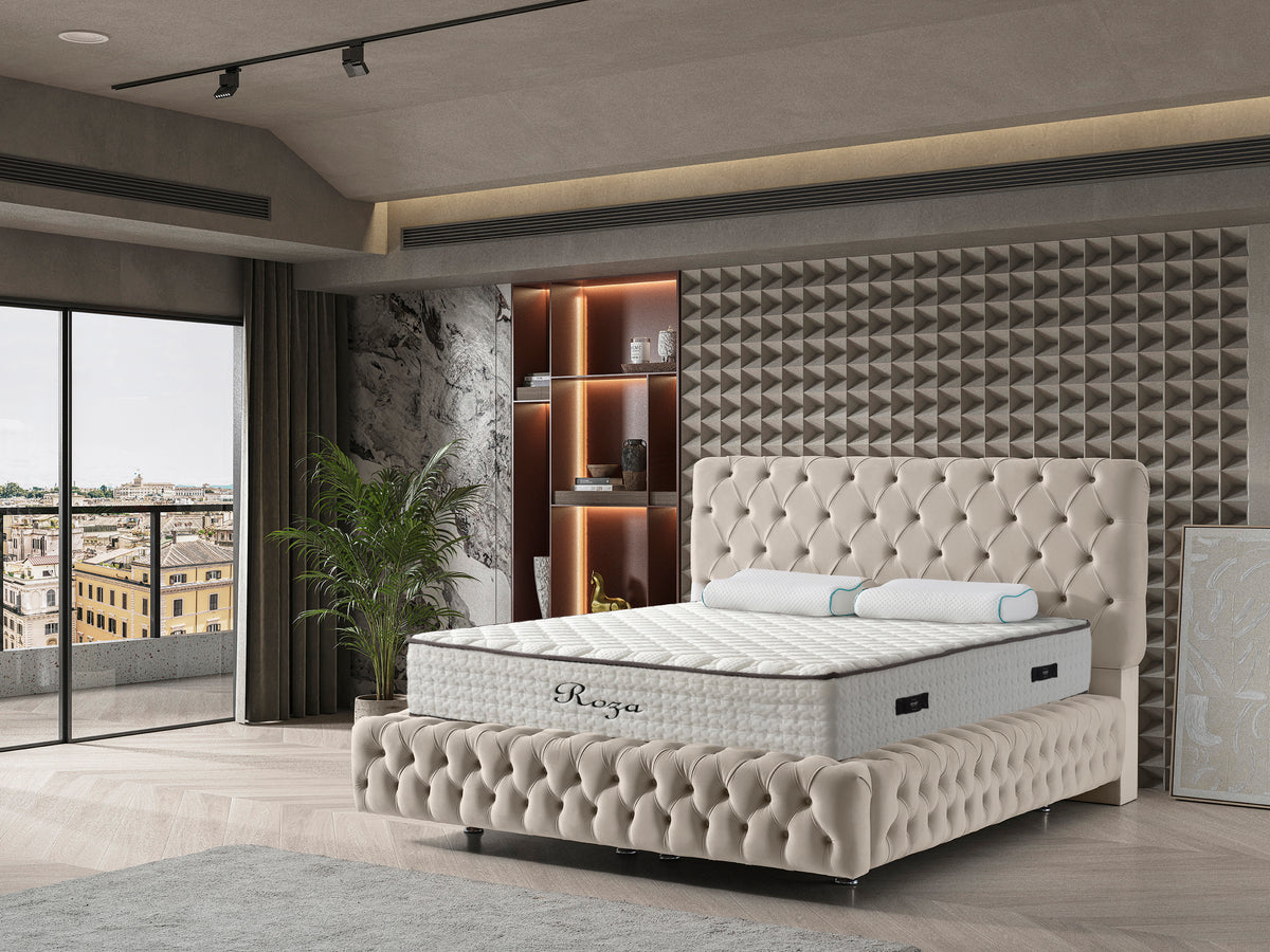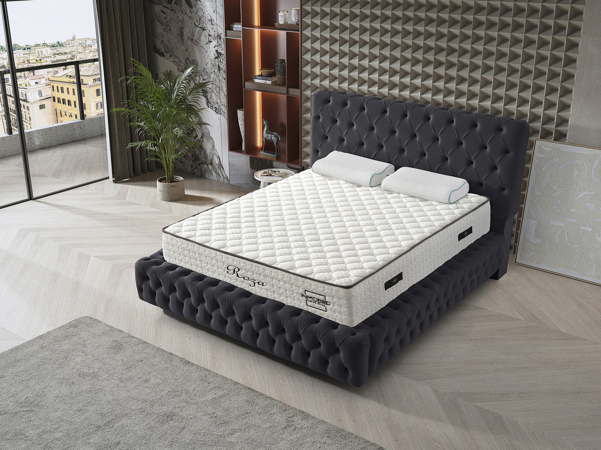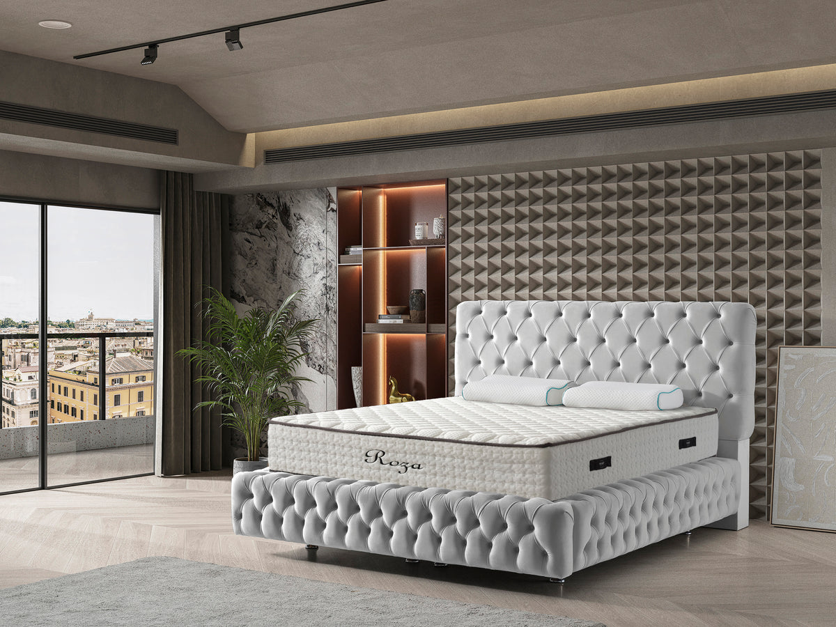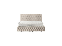 - Das Boxspringbett ist aus stabilen und extrem langlebigen Materialien gefertigt und wird standardmäßig mit einem Aufbewahrungskasten und einer PREMIUM-Matratze geliefert.
