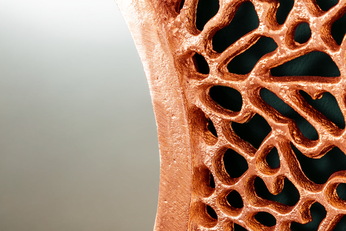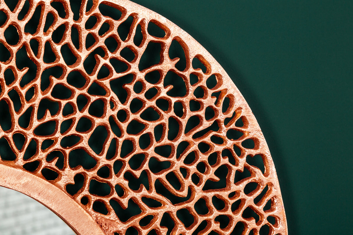 Dieser Spiegel ist viel mehr als nur ein Spiegel! Dank seines auffälligen, kupfernen Rahmens in einem filigranen Muster ist er zugleich ein wunderschönes Wohn-Accessoire. Das Muster erinnert an die feinen Verästelungen eines getrockneten Blatts und vereint damit glamourösen Stil mit einem Hauch von natürlichem Charme. Dabei wurde der Rahmen bewusst etwas unregelmäßig gestaltet, um den Stil des natürlichen Blättermusters zu unterstreichen.