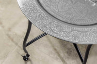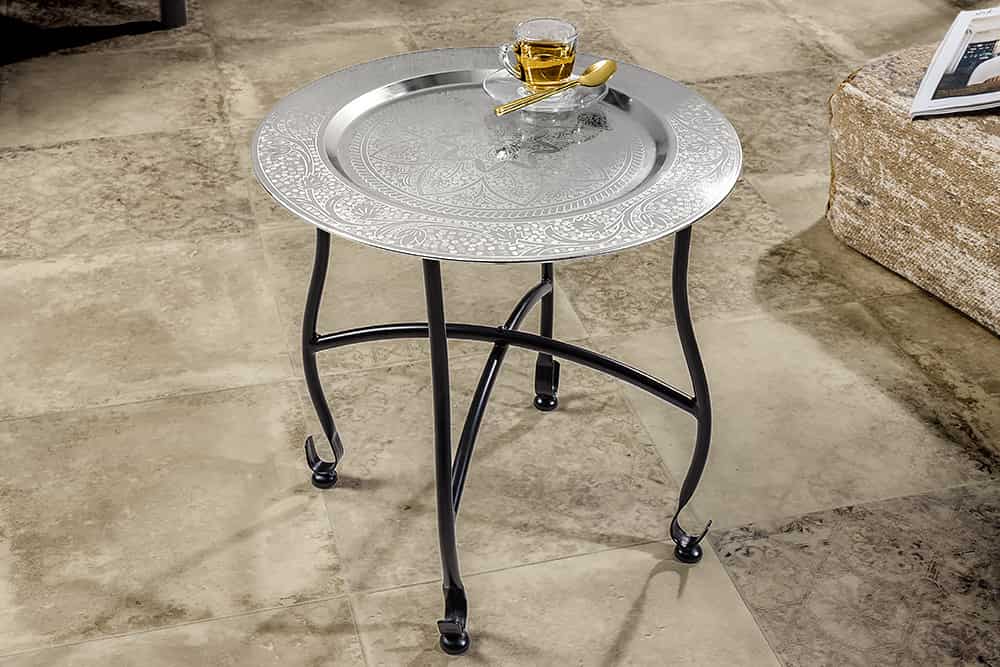 Der stilvolle Beistelltisch MARRAKESCH bietet eine praktische Ablagefläche und verleiht jedem Raum eine elegante Note. Sein silbernes Finish sorgt für einen edlen Glanz, während das klappbare Untergestell eine flexible Nutzung und platzsparendes Verstauen ermöglicht. Ob im Wohnzimmer, Schlafzimmer oder im Wintergarten – der Tisch fügt sich harmonisch in jede Umgebung ein und bringt das marokkanische Lebensgefühl direkt zu Dir nach Hause. Bestelle jetzt den Beistelltisch MARRAKESCH und entdecke das orientalische Flair für Dein Ambiente!